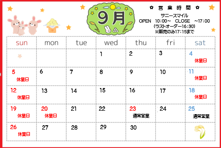 手づくり工房コスモス 2021/08/24 クッキー&カフェ「サニースマイル」9月の営業日のお知らせ クッキー&カフェ「サニースマイル」の9月の営業日のお知らせです。 営業時間:10:00~17:00 〒910-3606 福井県福井市田尻栃谷町38-46-...