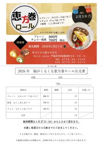 手づくり工房コスモス 2026/01/14New 恵方巻ロール注文のお知らせ 手づくり工房コスモスから恵方巻ロールのお知らせです。 今年の節分は2月3日(火)です。 南南東を向いて、ぜひコスモスの恵方巻ロールを 皆さまでお召し上がり...