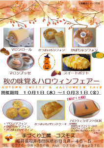 手づくり工房コスモス 2025.09.26 秋の味覚&ハロウィンフェアー 10月1日(水)から10月31日(金)まで 秋の味覚&ハロウィンフェアーを開催します! マロン・さつまいも・かぼちゃなど食欲の秋に ぴったりなスイ...